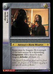 | Formatted Game Text | Muss auf Aragorn gespielt werden. Solange du keine Bedrohung entdecken kannst, ist Aragorn Verteidiger +1. |
