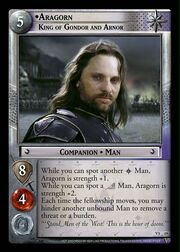 While you can spot another [Gondor] Man, Aragorn is strength +1.While you can spot a [Rohan] Man, Aragorn is strength +2.Each time the fellowship moves, you may hinder another unbound Man to remove a threat or a burden.