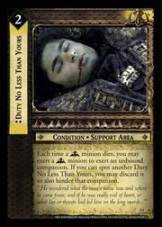 Each time a minion dies, you may exert a minion to exert an unbound companion. If you can spot another Duty No Less Than Yours, you may discard it to also hinder that companion.