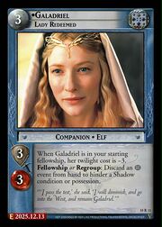 Galadriel, Lady Redeemed has proven over time to be too cost-effective at counteracting too broad a range of possible strategies. Much like Legolas, Dauntless Hunter (4R73) before it was added to the X-List, this Galadriel's impact on the tournament environment could be seen in the shrinking number of decks making any serious use of Shadow conditions (and possessions). Removing Galadriel from the Standard format makes way for many dozens of possible condition-oriented strategies to become competitive.