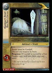 Bearer must be Gandalf.\Discard any weapon he bears.\Response: If Gandalf is exerted by a Free Peoples card, heal him (limit once per turn).