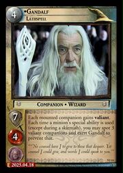 Each mounted companion gains valiant.Response: If a minion's special ability is used (except during a skirmish), spot 3 valiant companions and exert Gandalf to prevent that and wound that minion.