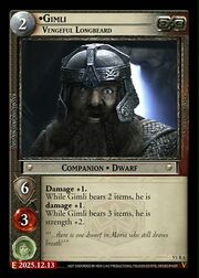 This page defines the card data as used on the main Data:Gimli, Vengeful Naugrim (V1 3) article. Only edit the information on this page if there is an obvious typo or if you otherwise know what you're doing.