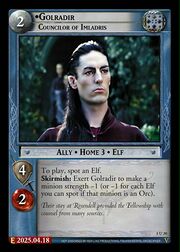 This page defines the card data as used on the main Data:Golradir, Councilor of Imladris (3U20) article. Only edit the information on this page if there is an obvious typo or if you otherwise know what you're doing.