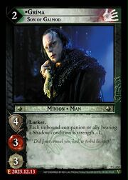 This page defines the card data as used on the main Data:Grima, Son of Galmod (4C153) article. Only edit the information on this page if there is an obvious typo or if you otherwise know what you're doing.
