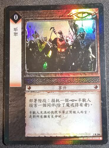 - Foil versions of Movie-era Rare cards were randomly selected to be inserted into booster packs at a rate of 1 out of 26 packs (~3.8% of packs). This means any given FotR booster pack had a 1 in 3,146 (~0.038%) chance of containing a foil Hate.