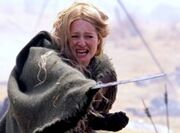 "'You look upon a woman. Éowyn I am, Éomund's daughter. You stand between me and my lord and kin. Begone, if you be not deathless! For living or dark undead, I will smite you, if you touch him.'"