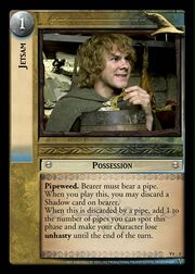 Pipeweed. Bearer must bear a pipe. When you play this, you may discard a Shadow card on bearer. When this is discarded by a pipe, add 1 to the number of pipes you can spot this phase and make your character lose unhasty until the end of the turn.