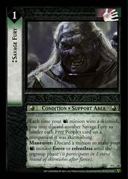 Each time your <symbol>isengard</symbol> minion wins a skirmish, you may discard another Savage Fury to hinder each Free Peoples card on a companion it was skirmishing. Maneuver: Discard a minion to make your <symbol>isengard</symbol> minion fierce or relentless until the regroup phase (it participates in 1 extra round of skirmishes after fierce).