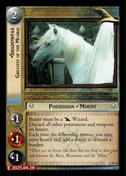 This page defines the card data as used on the main Data:Shadowfax, Greatest of the Mearas (17R24) article. Only edit the information on this page if there is an obvious typo or if you otherwise know what you're doing.