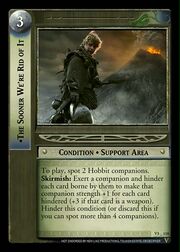 To play, spot 2 Hobbit companions. Skirmish: Exert a companion and hinder each card borne by them to make that companion strength +1 for each card hindered (+3 if that card is a weapon). Hinder this condition (or discard this if you can spot more than 4 companions).