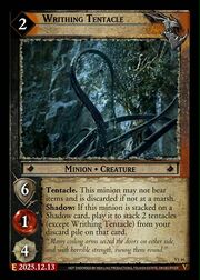 Tentacle. This minion may not bear items and is discarded if not at a marsh.\Shadow: If this minion is stacked on a Shadow card, play it to stack 2 tentacles (except Writhing Tentacle) from your discard pile on that card.