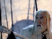 "All fled before his face. All save one. There waiting, silent and still in the space before the Gate, sat Gandalf upon Shadowfax."