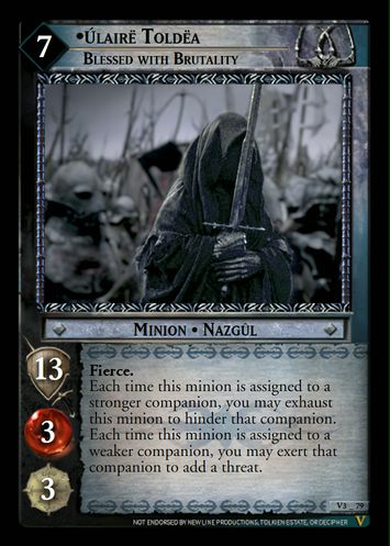 Toldea is strong against The Prancing Pony, which may push the opponent into 4 burdens if they also had to bid. As the only version of Toldea available in Fellowship Block, Messenger of Morgul can feature in almost any Nazgul deck.
