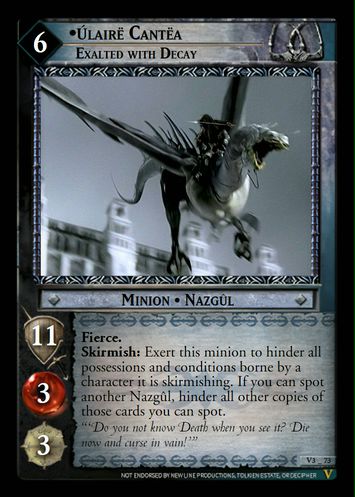 Skirmish: Exert this minion to hinder all possessions and conditions borne by a character it is skirmishing. If you can spot another Nazgul, hinder all other copies of those cards you can spot. |