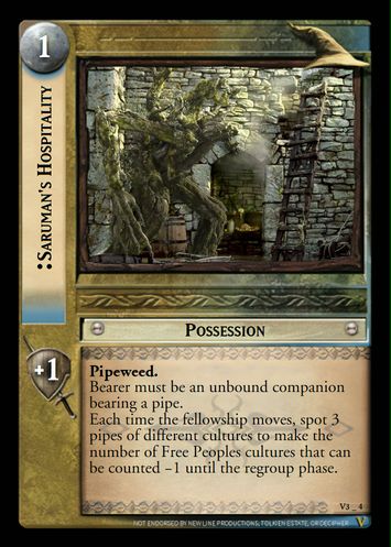 Bearer must be an unbound companion bearing a pipe. Each time the fellowship moves, spot 3 pipes of different cultures to make the number of Free Peoples cultures that can be counted -1 until the regroup phase. | ||