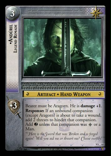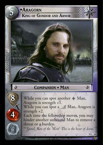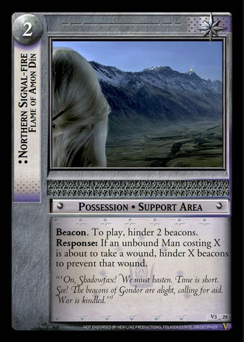 Bearer cannot be exerted, wounded, or assigned to a skirmish. At the start of the regroup phase, discard a condition on bearer (and heal bearer if Gandalf is in the dead pile). | ||