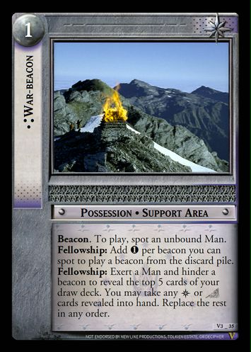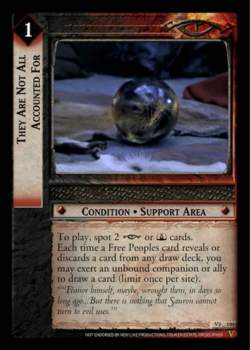 Condition • Support Area,Support Area | To play, spot 2 Each time a Free Peoples card reveals or discards a card from any draw deck, you may exert an unbound companion or ally to draw a card (limit once per site). | ||