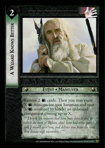 Companion • Wizard | Skirmish: Place 3 cards from hand on top of your draw deck to make a minion skirmishing an unbound companion strength –3. Any Shadow player may place 3 cards from his or her hand on top of his or her draw deck to prevent this. | ||