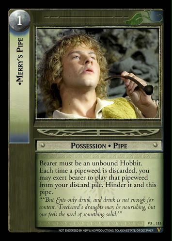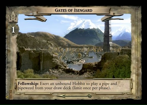 Site | Fellowship: Exert an unbound Hobbit to play a pipe and pipeweed from your draw deck (limit once per phase).