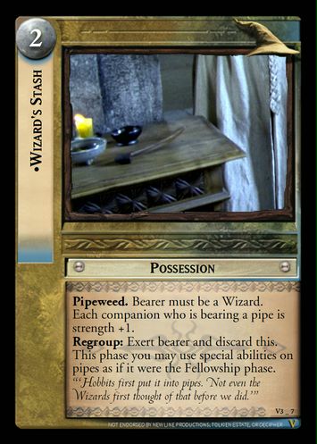 Each companion who is bearing a pipe is strength +1. Regroup: Exert bearer and discard this. This phase you may use special abilities on pipes as if it were the Fellowship phase. | ||