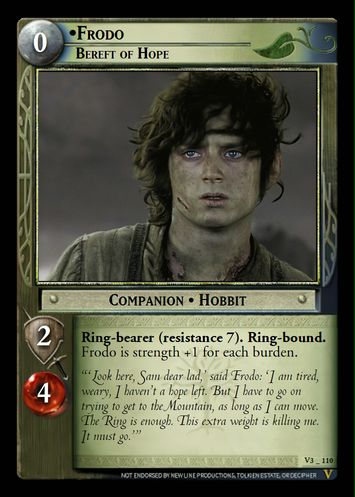 Fellowship: Play a Hobbit companion to remove a burden. Response: If Frodo is killed, make Sam the Ring-bearer (resistance 5). | ||