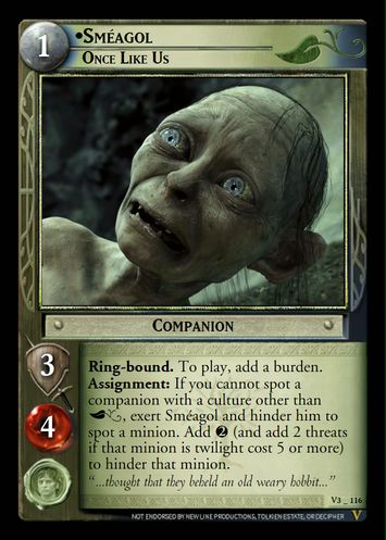 Skirmish: Add a number of threats equal to the total vitality of the minions Sméagol is skirmishing to discard Sméagol. Regroup: Discard Sméagol to take a | ||